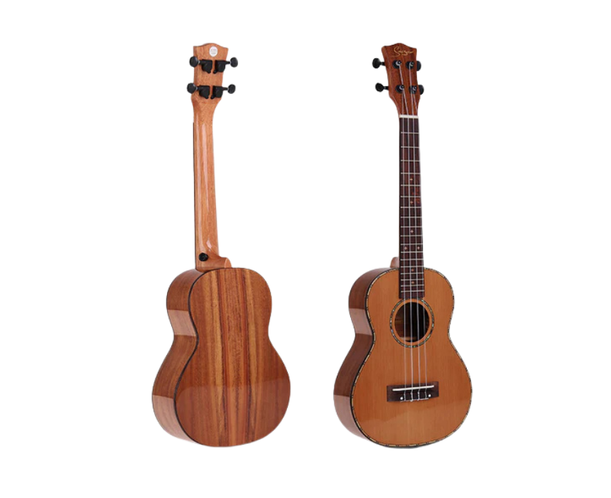 The Smiger Tenor Ukulele combines premium tone and professional-grade construction at an exceptional value. Featuring a solid western cedar top, Koa or East Indian rosewood back and sides, ebony fingerboard, and Aquila Nylgut strings, it delivers rich, lively sound with authentic Hawaiian resonance. High-gloss finish, intricate binding, die-cast tuners, and a solid walnut bridge complete this beautifully crafted instrument. Package includes a soft case.