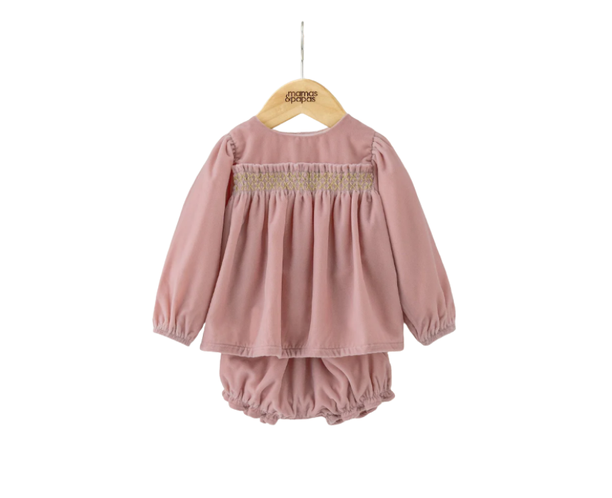 The Smock Velvet Dress & Bloomers set is an elegant two-piece outfit, perfect for dressy days and special occasions. The long-sleeved, lined velvet top features delicate embroidered smocking and a back button fastening, while the matching bloomers have an elasticated waistband and leg channels for comfort. Ideal for pairing with soft shoes or tights, this set creates a polished and adorable look for little ones.