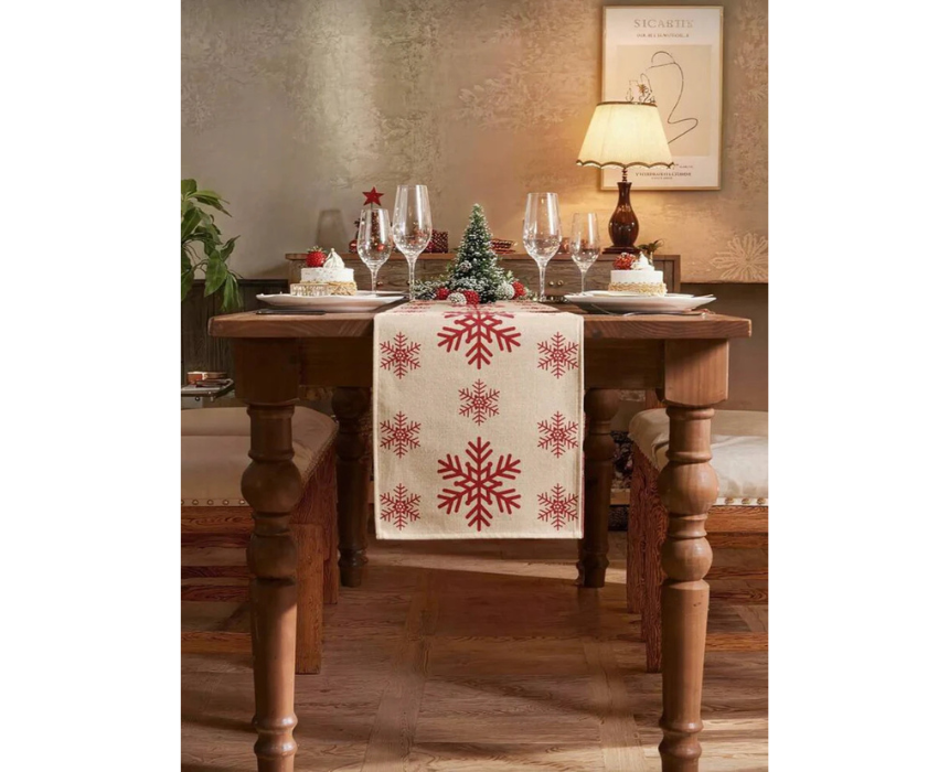Add festive charm with this Red Snowflake Linen Table Runner, crafted from premium linen with a classic red and white snowflake design. Heat- and stain-resistant, wrinkle-free, and machine washable, it protects tables while creating an elegant holiday display. Perfect for family dinners, restaurant settings, or seasonal décor, it pairs beautifully with candles, greenery, or metallic accents for a cozy Christmas atmosphere.