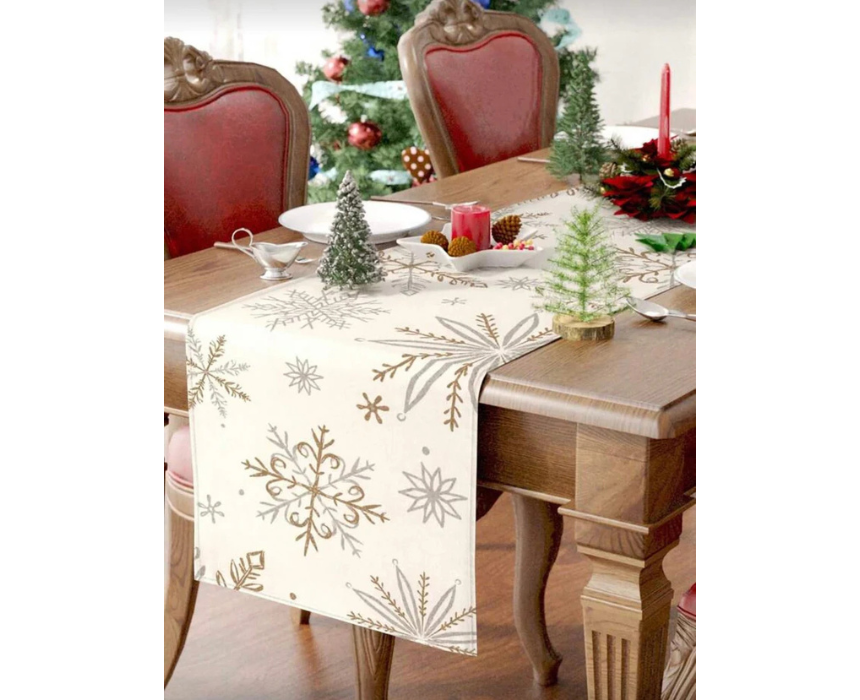 Elevate your holiday table with this Christmas linen table runner featuring a shimmering silver and gold snowflake pattern. Made from premium-quality linen in a 33×183 cm rectangular design, it adds a warm, elegant touch to dining tables, coffee tables, or sideboards. Pair it with candles, centerpieces, or classic tableware to create a festive and sophisticated Christmas setup for any gathering.