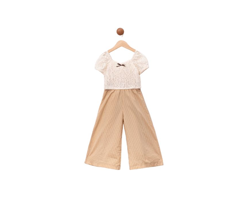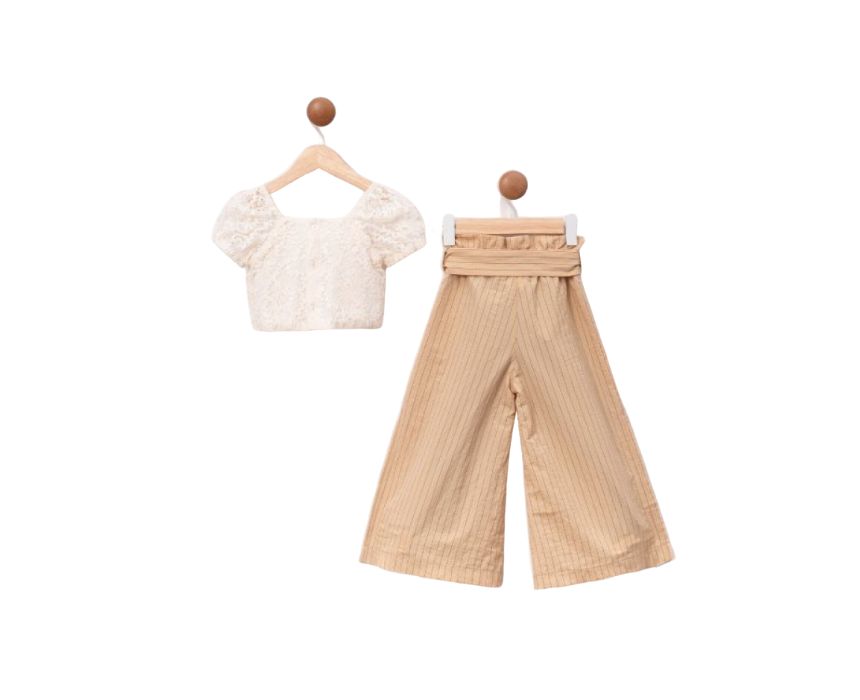 The Soft Grace Set for girls in off-white and beige blends elegance and comfort with a lace top (100% polyester) lined in soft 100% cotton, paired with cozy pants made from a 78% acrylic, 20% polyamide, and 2% polyester blend. Ideal for special outings or stylish everyday wear, this set brings a refined touch to any wardrobe. Pair it with neutral flats or sandals for a graceful, polished look.