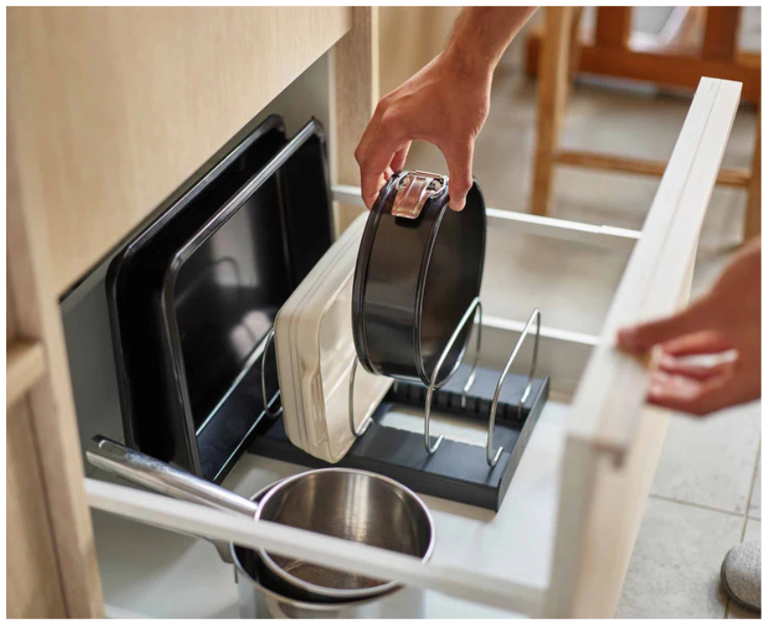 This baking sheet organizer keeps your bakeware neat and accessible with a sturdy frame and eight adjustable stainless steel dividers that fit different tray sizes. Ideal for baking sheets, cake tins, and roasters, it optimizes drawer space while keeping everything visible and easy to reach. Suitable for drawers with a minimum depth of 21 cm, it is easy to clean with a damp cloth and separates for recycling at end of life.