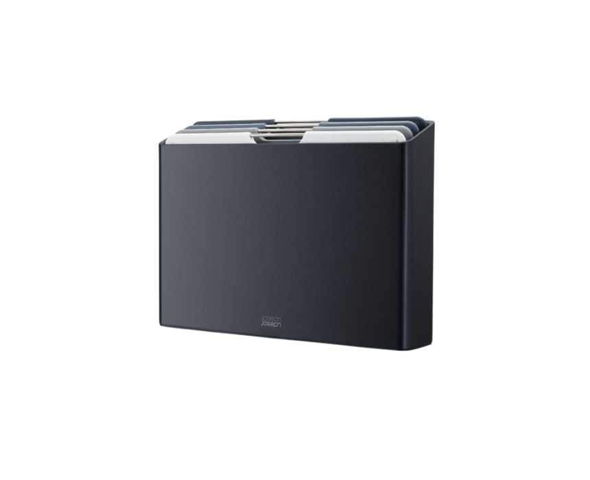The Folio chopping board set features four colour coded boards with knife friendly textured surfaces, non slip feet, and a slimline storage case with stainless steel bars for easy selection and airflow. Designed for safer slicing and organised food prep, the double sided boards are dishwasher safe, BPA free, and sized at 24 x 34 cm, with the full case measuring 26 x 35.7 x 7.5 cm. Ideal for everyday kitchens, the boards can be neatly stored upright and styled directly on the countertop for quick access.