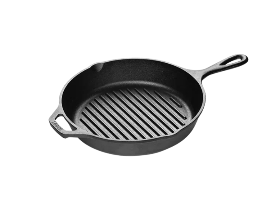 This Cast Iron Grill Pan delivers delicious grilled flavor indoors, featuring raised grill lines and excellent heat retention for even cooking. Made in the USA and seasoned with 100% natural vegetable oil, it is compatible with all stovetops including induction, as well as oven, grill, and campfire use. Durable and PFAS-free, this pan is built to last for generations and is ideal for grilling burgers, meats, and vegetables.