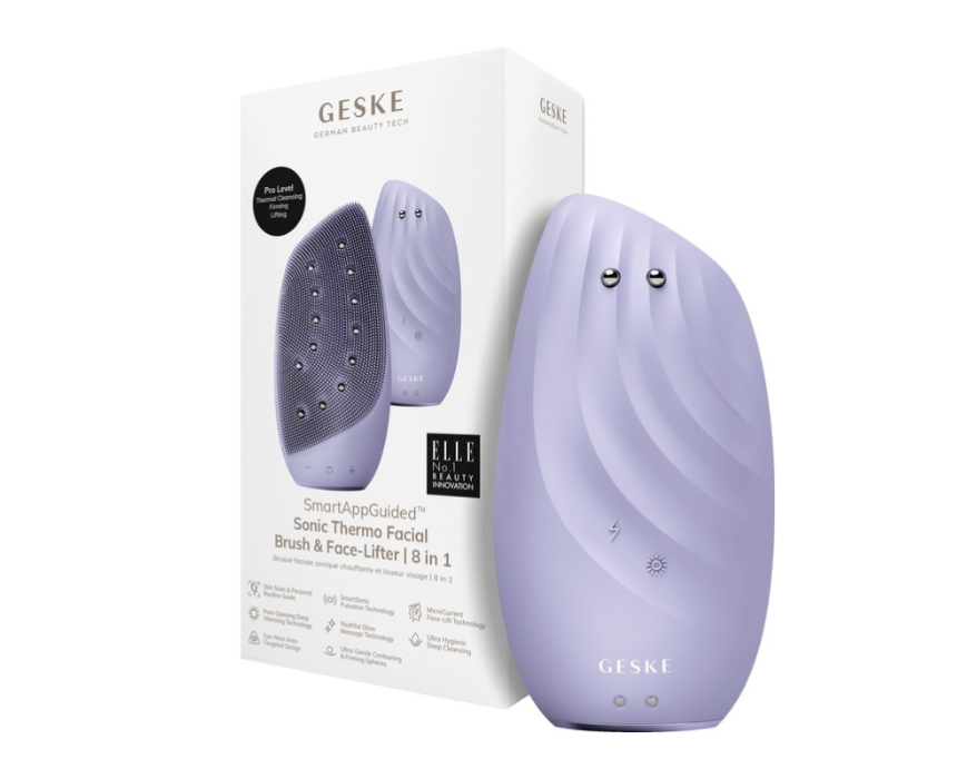 The GESKE Sonic Thermo Facial Brush & Face-Lifter | 8 in 1 cleanses, exfoliates, and lifts skin with sonic vibrations, heat, and microcurrent for a firmer, smoother, and radiant complexion. Its eight interchangeable heads target impurities, fine lines, and sagging areas while improving circulation and boosting product absorption. Use with your favorite cleanser or serum for a professional spa-like facial at home.