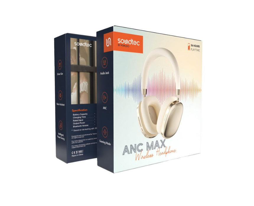 The Soundtec Airpodmax ANC Headphone Black PD STWLEP023 BK delivers powerful audio with active noise cancellation in a comfortable over ear wireless design. Finished in classic black, it is ideal for travel, office, and daily listening and can be styled easily with casual, work, or minimalist outfits for a clean modern look.