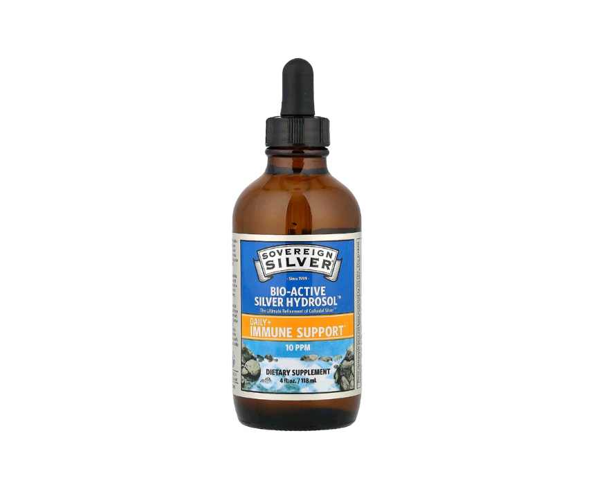 Sovereign Silver Bio-Active Colloidal Silver Hydrosol Dropper offers a pure 10 ppm formula made with 99.999 percent silver and pharmaceutical grade purified water, featuring ultra small particles for high bio activity and packaged in non leaching glass. Non GMO, vegan, gluten free, and produced in a GMP certified facility, it is the leading silver supplement in the U.S. since 2005. It can be used by simply applying drops as directed for daily wellness routines.