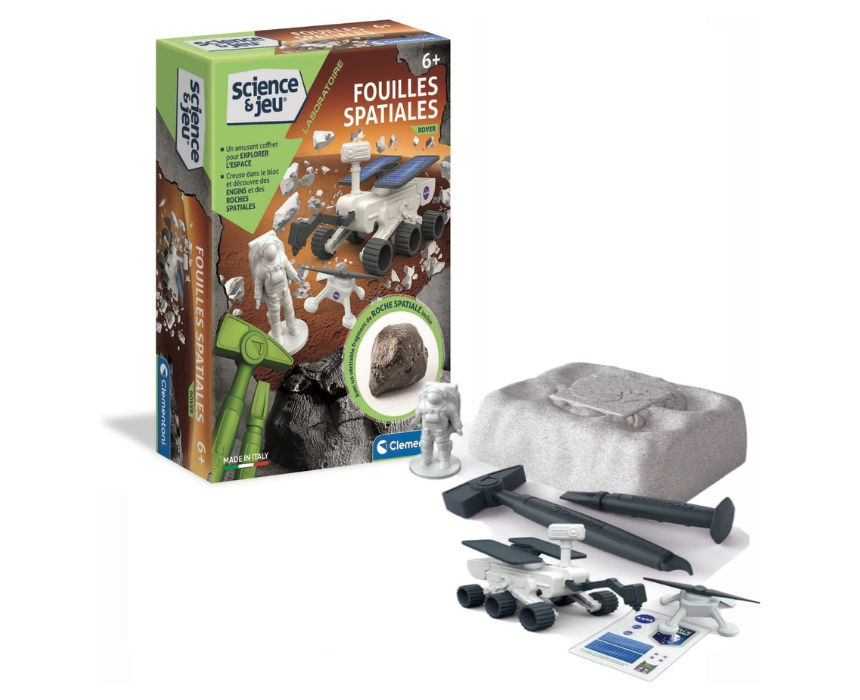 This space exploration science kit lets children aged 6+ uncover real meteorite fragments and assemble special space vehicles. The set includes a plaster brick, hammer, and scalpel to dig out a Martian rover, an astronaut figure, and a meteorite rock fragment. Designed in Italy, it provides a hands-on experience for aspiring cosmonauts, combining excavation, assembly, and imaginative space missions in a fun and educational way.