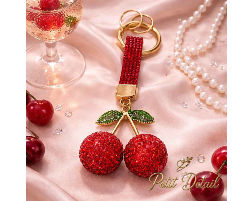 This sparkling cherry bag charm features a glossy decorative design with shimmering accents and a secure clasp for easy attachment. Perfect for styling on handbags, backpacks, or totes, it adds a playful yet stylish touch to everyday looks. Lightweight and eye catching, it is ideal for personal use or as a thoughtful gift.