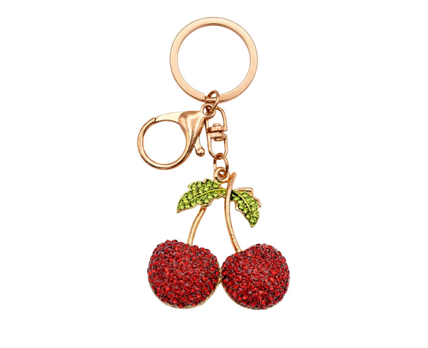 This sparkling cherry charm keychain features a glossy decorative design with shimmering accents and a sturdy metal clasp for secure attachment. Perfect for styling on handbags, backpacks, or keys, it adds a playful and stylish touch to everyday looks. Lightweight and eye catching, it is ideal for personal use or as a thoughtful gift.
