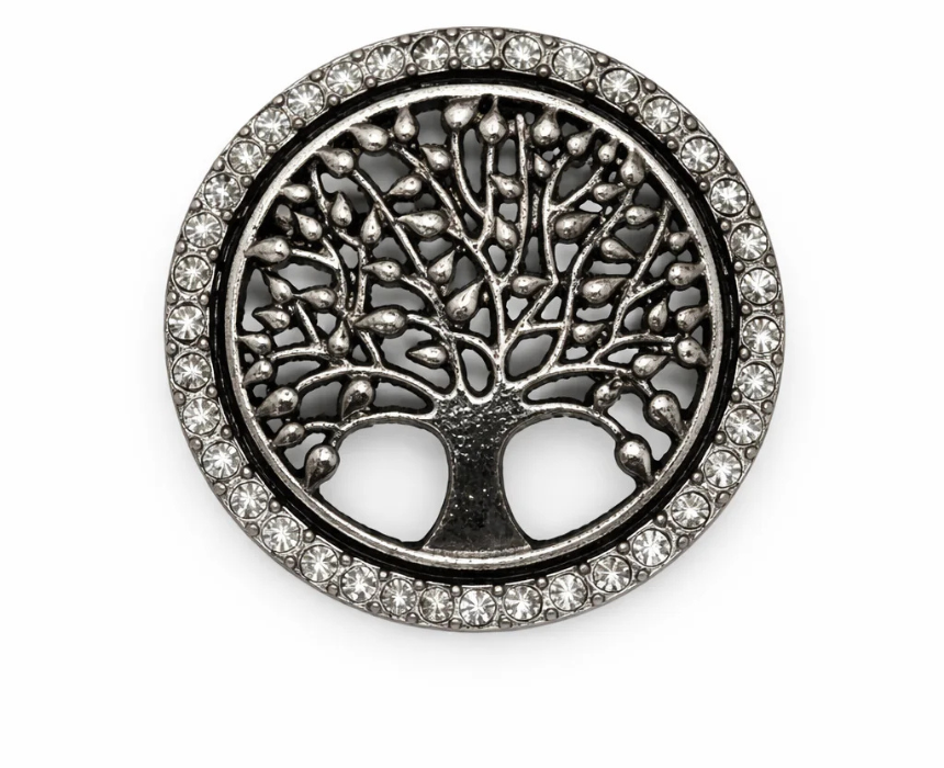 This brooch features a sparkling tree of life design that represents growth and connection, accented with shimmering details for an elegant and meaningful accessory. Crafted with refined workmanship, it can be styled on jackets, blazers, scarves, hats, or bags to add a symbolic statement and enhance both casual and formal outfits with a touch of brilliance.