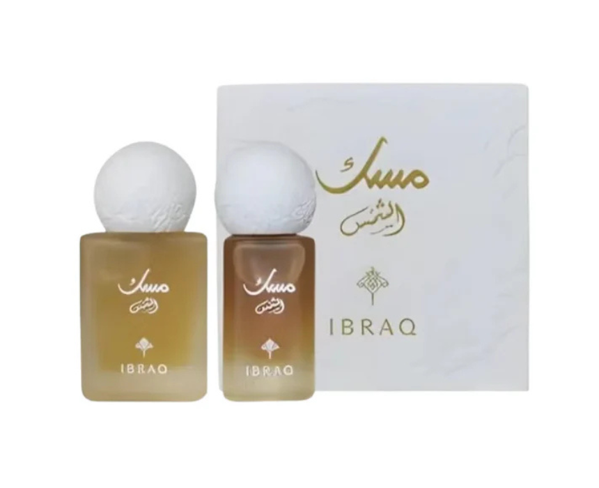 The Special Musk Al Shams Set by Ibraq Ibrahim Al Qurashi includes a perfume and body oil, blending floral, musky, and spicy notes for a fresh and captivating scent. It opens with orange blossom, bergamot, and cardamom, flows into a heart of vanilla and elemi, and settles on a base of musk, sweet almond, ambroxan, and guaiac wood. Perfect for men and women seeking understated sophistication and long-lasting elegance.