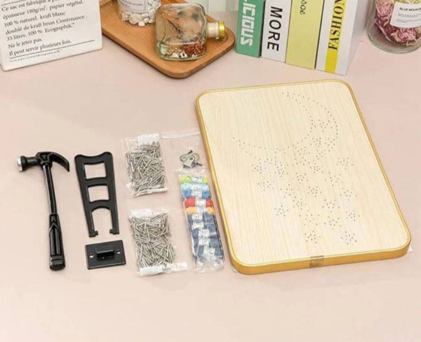 The Spectral Showers String Art Kit Large is a complete DIY craft set featuring colorful strings and a pre nailed wooden board to create a stunning abstract design inspired by cascading light. Once assembled, it can be displayed on a wall, desk, or shelf to add a vibrant and artistic decorative touch. Ideal for beginners, craft enthusiasts, and gift giving.