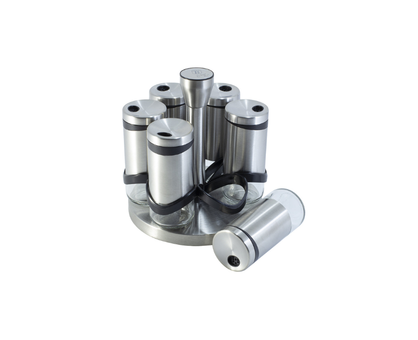 The Berlinger Haus BH-1991 Black Silver Collection Spice Rack Set combines premium stainless steel and clear glass shakers to bring elegance and practicality to any kitchen. The set includes six 120 ml shakers on a rotatable rack for easy access, while the transparent design allows quick monitoring of spice levels. Compact, stylish, and easy to clean, it keeps your favorite seasonings organized and beautifully displayed.
