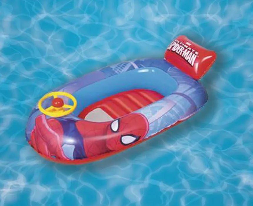 The Spiderman inflatable boat is designed for children aged 3 to 6, featuring an inflatable bottom for extra comfort and a supportive backrest. It includes a steering wheel with a built-in horn for added fun and engagement. Measuring 112 by 71 cm, this boat is perfect for young kids to enjoy safe and entertaining water play while comfortably sitting inside Designed for kids aged 3+