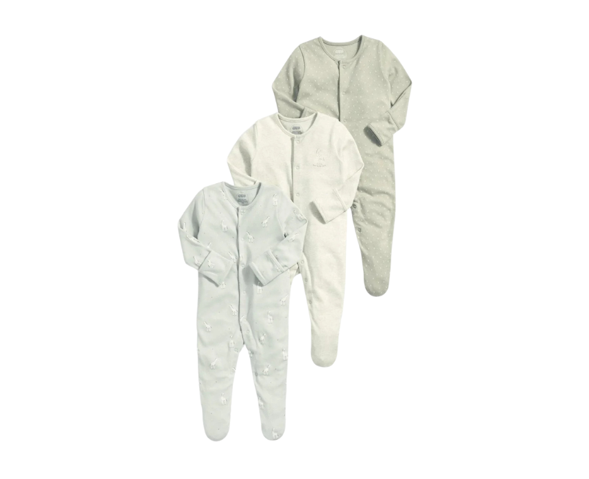 The Giraffe Sleepsuits Set of 3 – Spotty from the Welcome to the World collection offers cozy and practical all-in-one sleepwear for newborns. This 3-pack includes long-sleeve sleepsuits in oatmeal giraffe print, white stripe print, and plain white with giraffe motif, featuring wrap-front designs with concealed popper openings, integrated scratch mitts up to 9–12 months, and anti-slip soles from 12–18 months for little walkers. Perfect for everyday wear, naptimes, or layering for extra warmth.