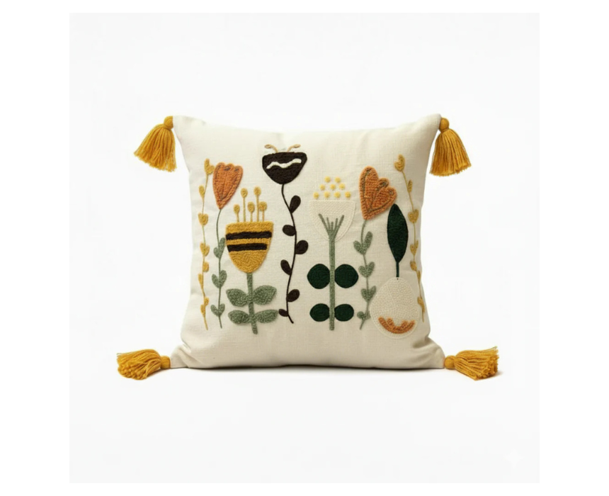The Contempo Floral Collection square cushion cover features detailed embroidery with yellow tassels and a vibrant folk blooms motif, sized 43×43 cm. Perfect for adding a pop of color to sofas, chairs, or beds, it complements modern and eclectic home décor styles effortlessly.
