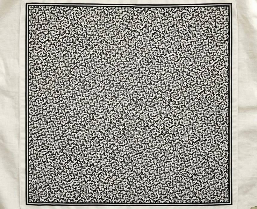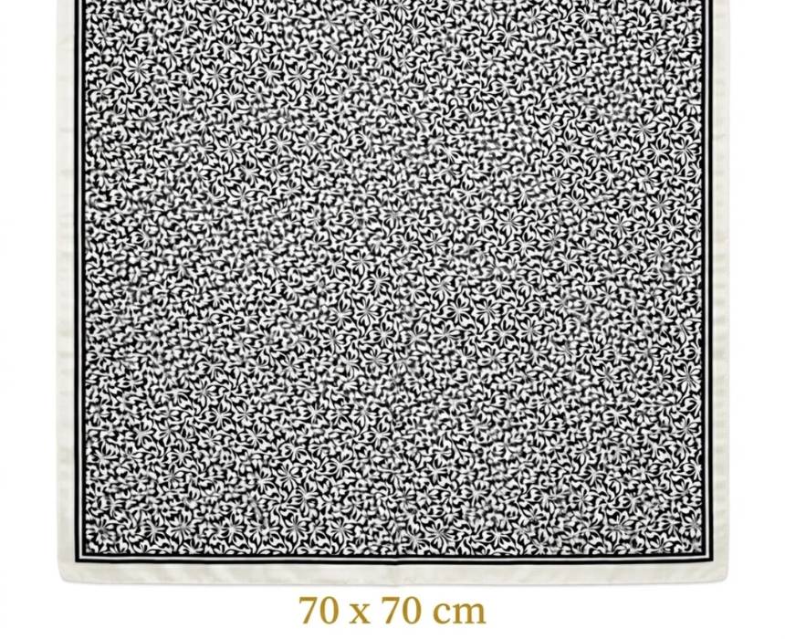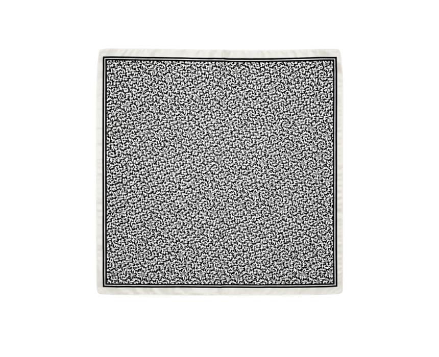 This square scarf features an elegant black and white floral print with a refined border for a timeless and polished look. Designed for versatile styling, it can be worn around the neck, in the hair, or tied to a bag to instantly elevate any outfit. Its classic monochrome palette makes it easy to pair with both casual and dressy styles.
