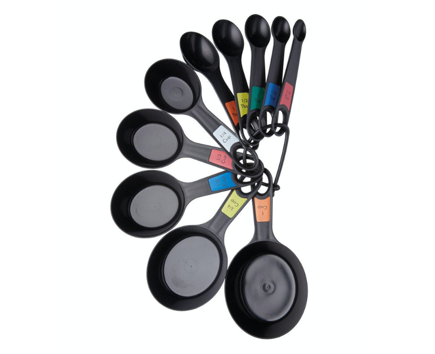 The Kitchen Craft 10-piece measuring cups and spoons set offers precise measurements from ¼ teaspoon to 1 cup, making it perfect for baking and cooking American or metric recipes. Made from durable black plastic, it handles both wet and dry ingredients with ease and is lightweight for everyday use. Keep them handy in the kitchen for accurate portioning and effortless recipe following.
