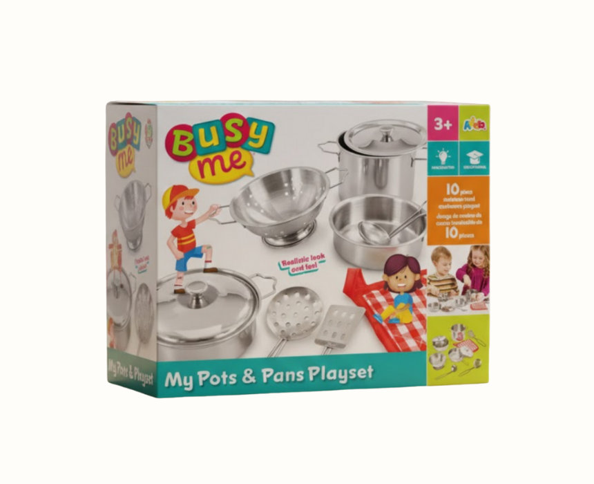 ADDO Pots and Pans Playset is designed for ages 3 and up and includes 10 pieces of high quality stainless steel utensils and cookware. Children can pretend to cook like grown ups using a frying pan with lid, saucepan, stockpot with lid, colander, fish slice, ladle, slotted spoon, and gingham pot holder. This imaginative playset encourages role play, creativity, and fun for little chefs exploring the world of cooking.