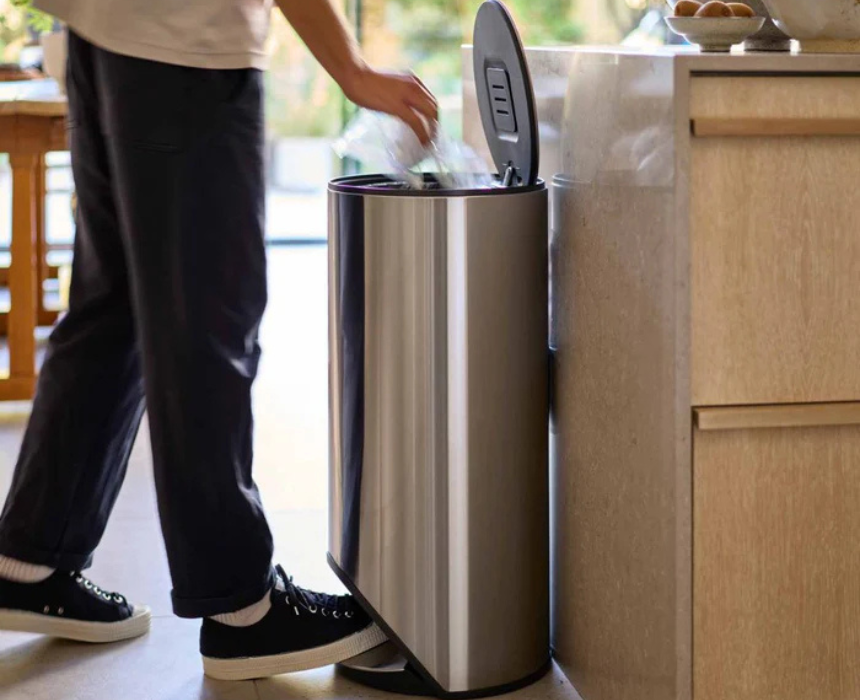 This 30L circular pedal bin features a large easy-push pedal that fits neatly within its footprint, saving floor space, and includes an integrated liner storage compartment for convenient access. The soft-close lid with fingerprint-proof stainless-steel finish ensures a sleek look, while the removable bucket allows easy emptying and cleaning. Compatible with Joseph Joseph IW5 custom-fit liners, it is ideal for keeping kitchens tidy and organized.