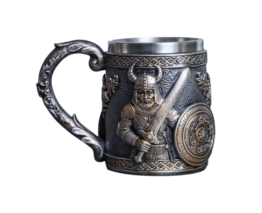 This stainless-steel Viking beer mug features a bold Norse inspired design with detailed warrior elements and a durable inner cup for easy cleaning. Built with strong construction and a premium feel, it is perfect for beer, coffee, or cold drinks while doubling as a decorative piece. Ideal for themed parties, home décor, or gifting, it adds a legendary touch to any occasion.