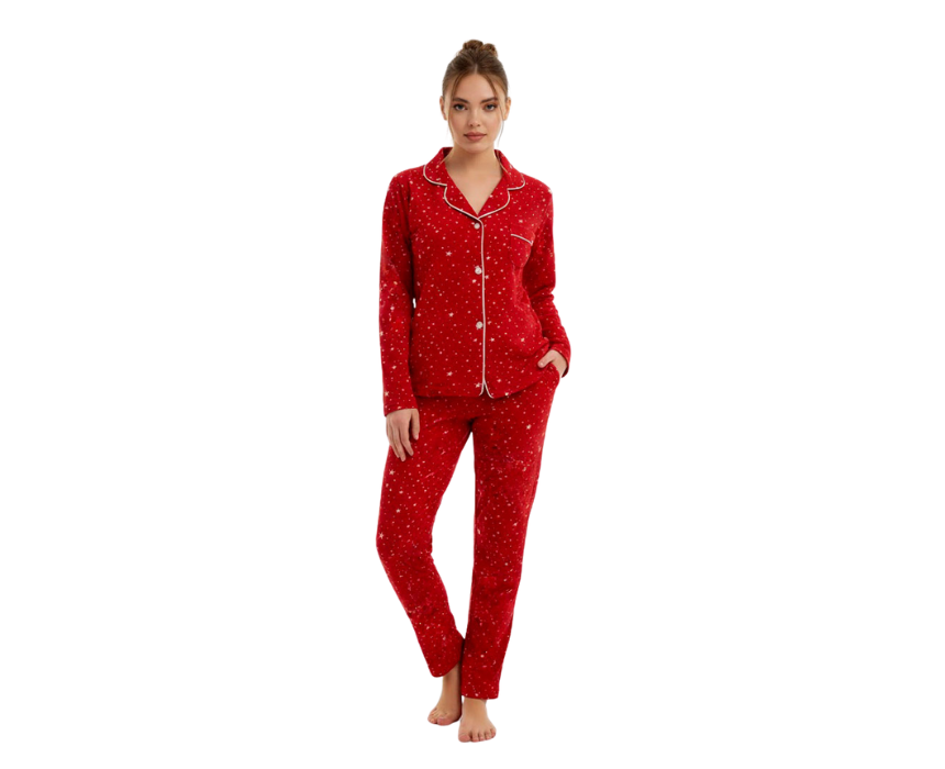 This red fleece pajama set with a stars pattern offers cozy warmth and a playful touch, perfect for lounging or sleeping. Made from soft, high-quality fleece, it ensures comfort and relaxation while adding a fun, stylish vibe to your homewear. Ideal for chilly nights or as a thoughtful gift. Also available in Black.