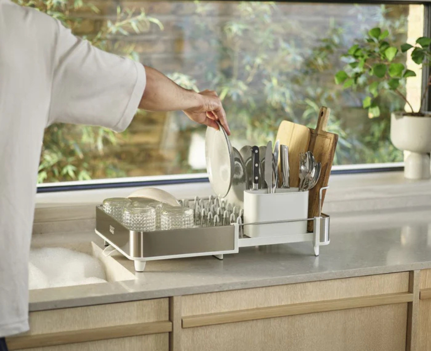The Extend™ expandable dish drainer makes washing up easier with its ability to extend to twice its size, accommodating more dishes and utensils. It features a movable draining spout, raised ribs to prevent water buildup under glasses and bowls, a cutlery drainer with knife slot, and non-scratch prongs and chopping board rail. Its stainless-steel finish with fingerprint-resistant coating adds a sleek touch, and it dismantles easily for hand washing and convenient cleaning.