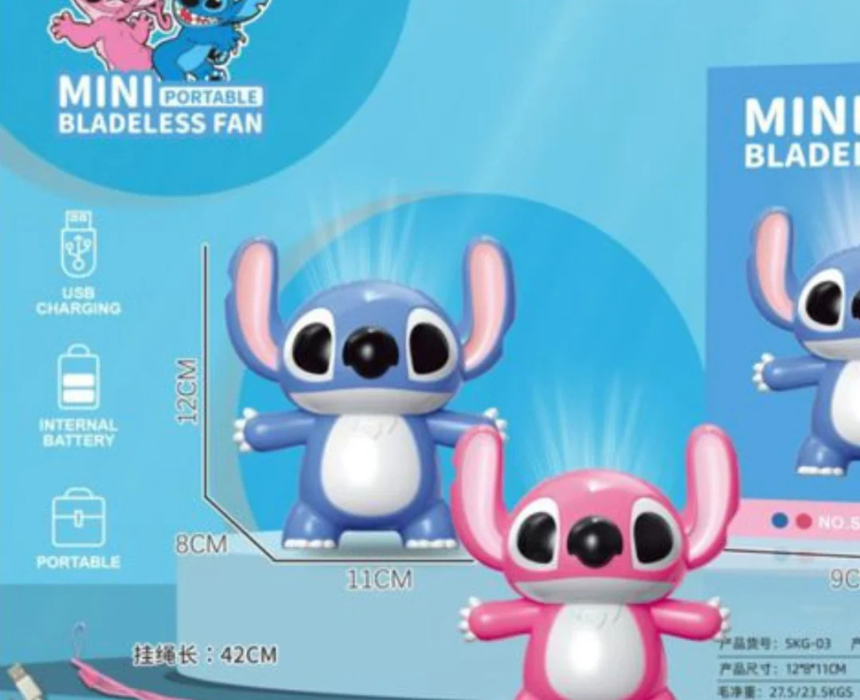The Stitch & Angel Portable Fan features a cute, compact design with USB charging and adjustable airflow, providing a refreshing breeze anywhere. Its lightweight, handheld style is perfect for travel, desk use, or outdoor activities, and pairs effortlessly with casual summer outfits or themed accessories.