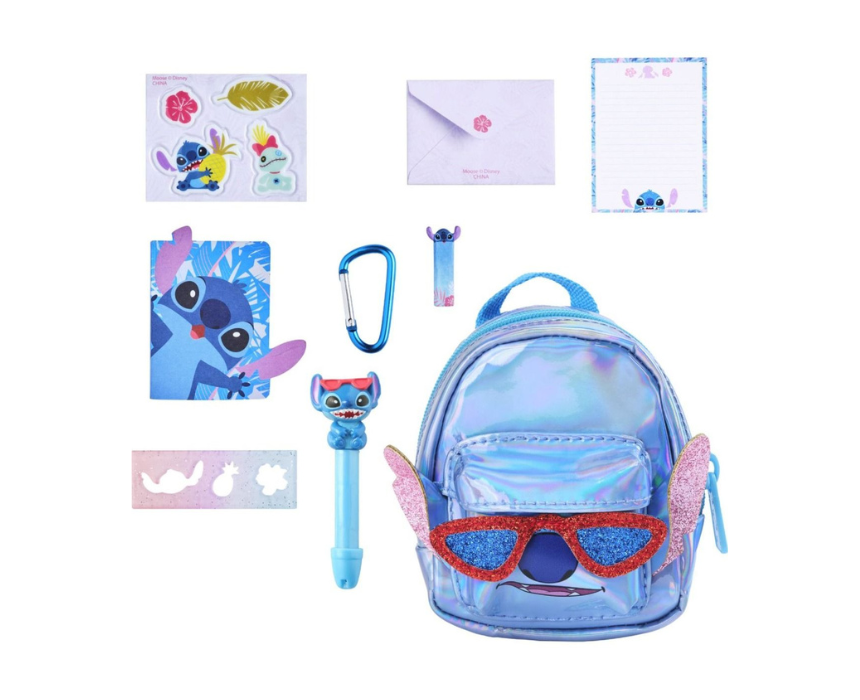 The Stitch mini backpack features a playful character design with detailed elements and opens to reveal functional stationery items for creative use. It includes mini accessories for writing, drawing, and decorating, all in a compact and portable format. Perfect for kids, it easily attaches to bags or accessories, making creativity fun and accessible on the go.