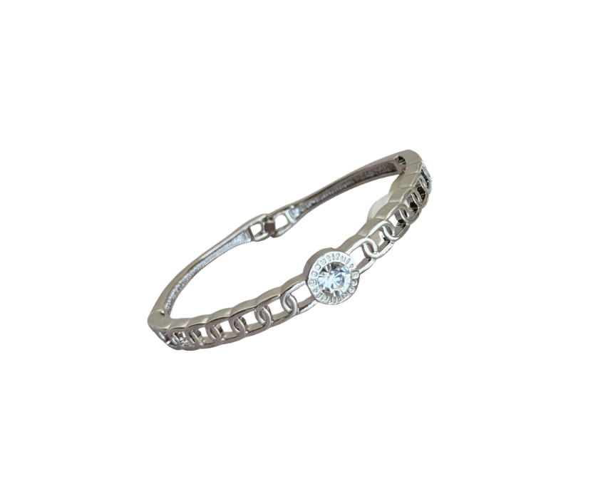 This stone bangle features a sleek design accented with elegant gemstones, adding a refined and stylish touch to any jewelry collection. Perfect for everyday wear, it can be worn alone for a subtle statement or stacked with other bangles for a modern layered look. Its versatile style complements both casual outfits and more polished ensembles effortlessly