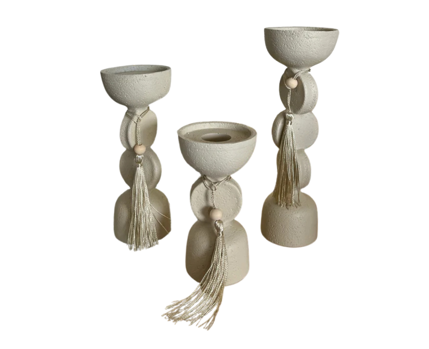 The Stone Candle Holder Set includes three elegantly crafted holders in varying sizes, featuring a modern design with subtle tassel accents. Available in beige or black, these holders provide ambient lighting while complementing contemporary décor. Their versatile style makes them perfect for living rooms, bedrooms, or festive settings, adding both functionality and decorative appeal to any space.