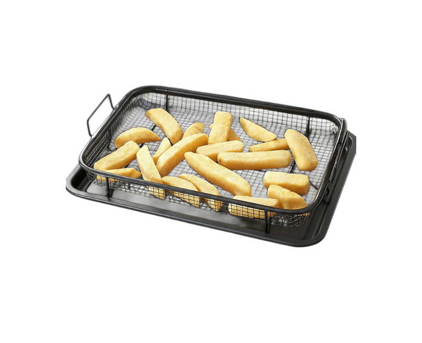Strainer and tray set (Tray: 31.5×24.5 cm, Strainer: 30.5×22.5 cm) lets you crisp up potatoes, chicken, and more with little to no oil. Available in black and silver.