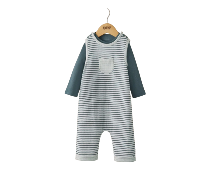 The Stripe Dungarees & Bodysuit Outfit Set is a stylish and practical 2-piece outfit for baby boys, combining soft striped dungarees with a coordinating bodysuit for everyday comfort. The dungarees feature easy fastenings for quick changes, while the bodysuit has popper openings for effortless dressing. Perfect for casual play, layering with a jumper, or pairing with soft shoes for a complete look.