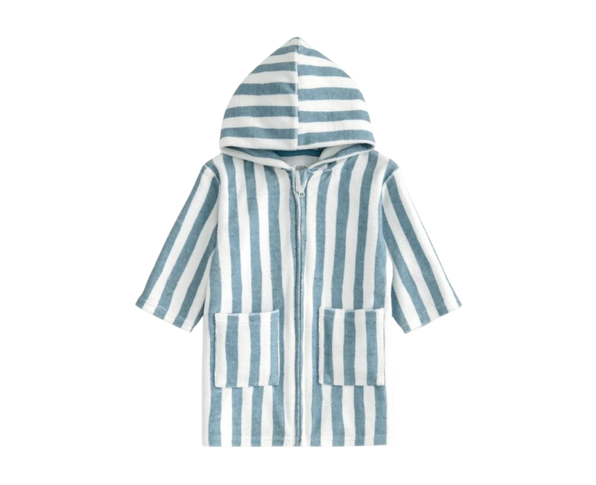 This striped hooded poncho is made from ultra-soft, absorbent towelling fabric, featuring a cosy hood, zip fastening, and practical patch pockets for comfort after bath or swim time. Designed to keep little ones warm and snug, it is both stylish and functional. Ideal to wear over swimwear or pyjamas at the beach, pool, or at home.