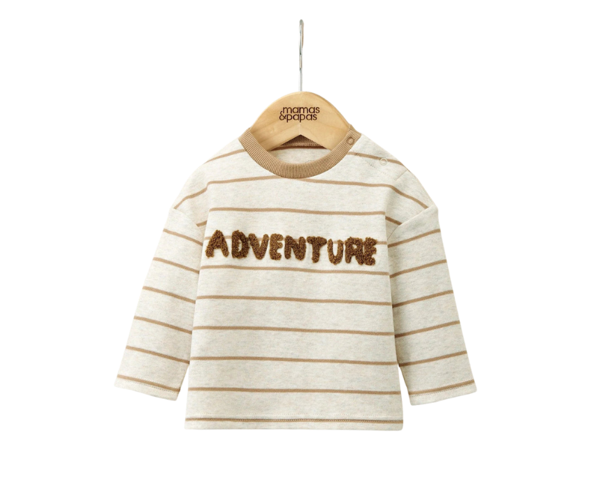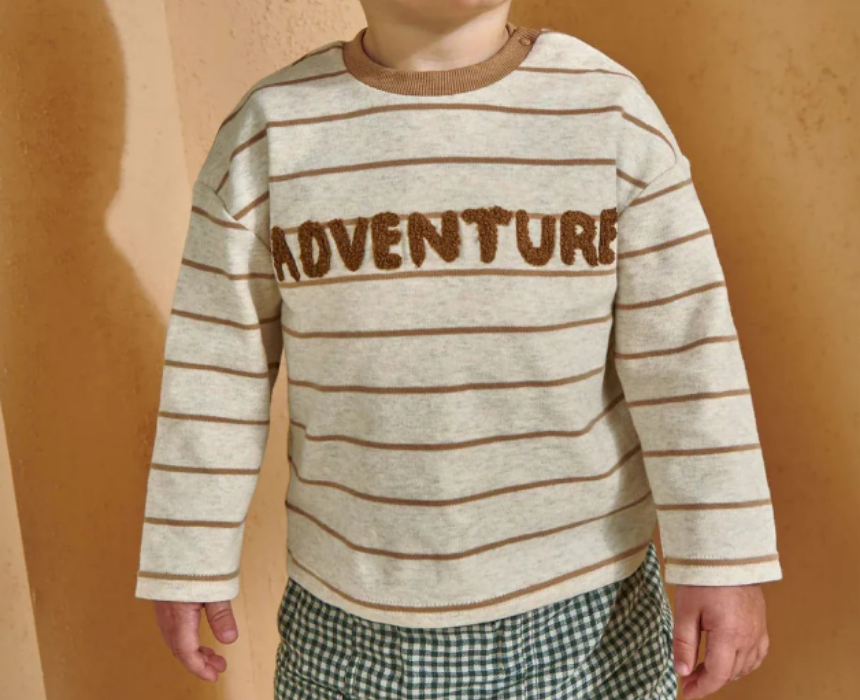 The Striped T-Shirt with Boucle Adventure Detail in cream is a cosy and stylish top for baby boys, perfect for little explorers. Featuring a timeless stripe pattern, long sleeves, ribbed neck, shoulder popper opening, and playful ‘Adventure’ boucle detail for added charm. Pair with jeans, trousers, or leggings for a comfortable and adventurous boys’ outfit.