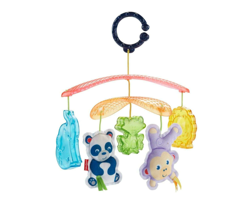 The Fisher-Price On-the-Go Stroller Mobile turns every outing into a playful adventure with five colorful animal toys that dangle overhead. Soft, textured panda and monkey toys encourage reaching and batting, while sunlit translucent toys like the elephant, froggy, and lion capture babies’ attention. Easy to attach to stroller canopies, this mobile stimulates visual senses and helps develop gross motor skills for infants on the move.