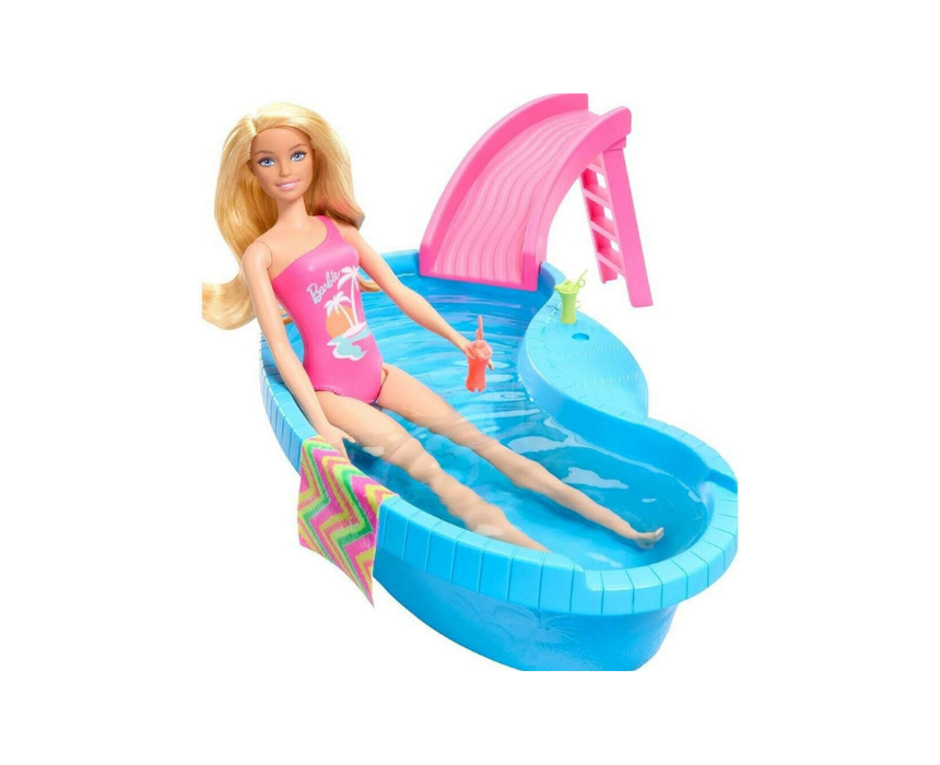 The Mattel Barbie Summer Pool with Doll Playset lets children enjoy endless poolside adventures with Barbie, featuring a pool, slide, and colorful accessories like a towel and two drinks. The set includes a Barbie doll in a pink tropical swimsuit, and can be expanded with additional dolls and playsets for more imaginative summer fun.