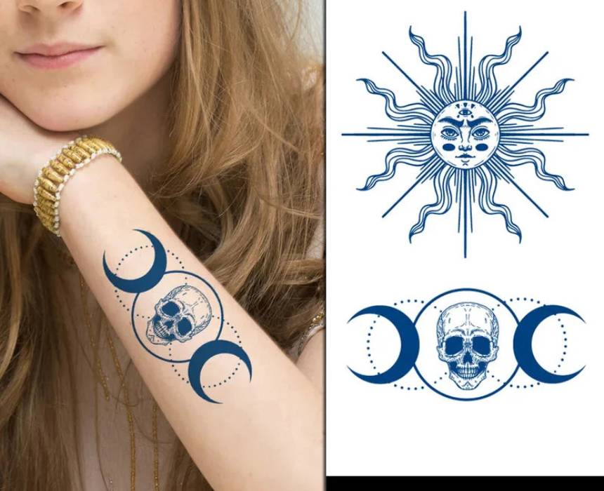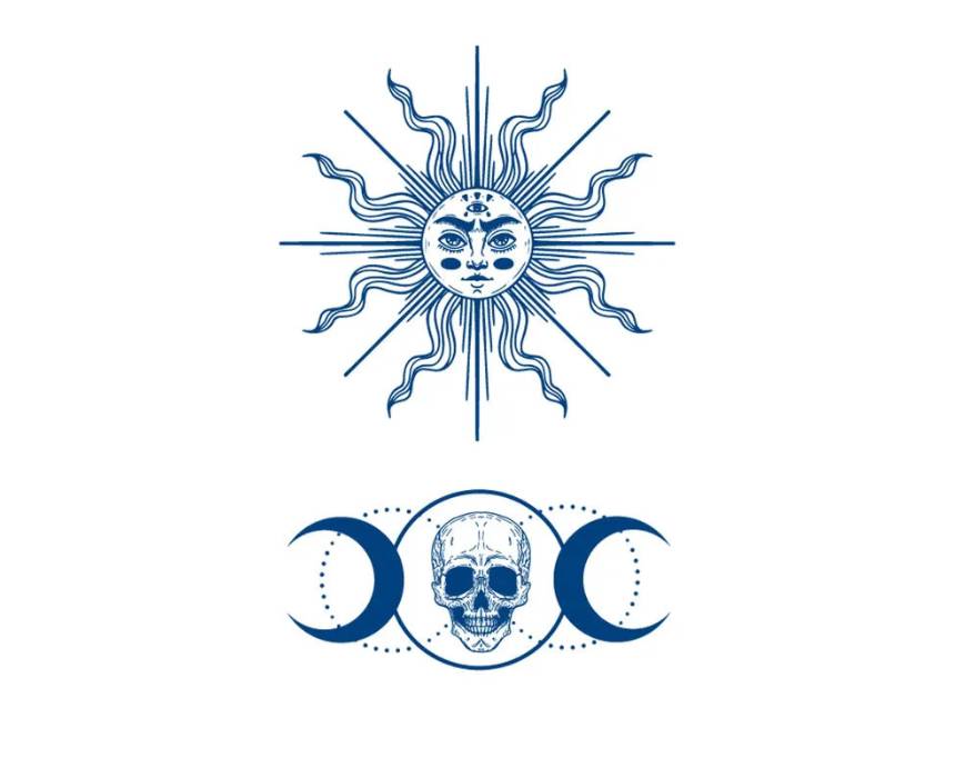 This Sun and Moon Jagua Tattoo Set features a balanced celestial design representing harmony and contrast in a stylish temporary body art format. Made with natural jagua, the tattoos develop into a deep blue black tone on the skin and last for several days. Perfect for styling on the wrist, forearm, or shoulder, they add a symbolic and artistic touch to everyday outfits or festival looks.