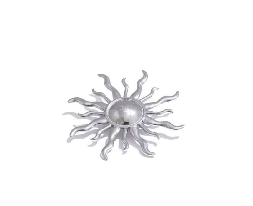 This stylish sun-shaped brooch features an 18K gold-plated steel design, perfect for adding a radiant and elegant touch to any outfit. Ideal for jackets, blouses, or scarves, it makes a unique statement piece.