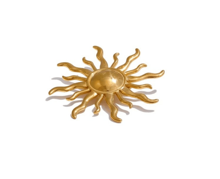 This elegant sun-shaped brooch is crafted from steel with 18K gold plating, adding a warm, luxurious accent to any outfit. Perfect for jackets, scarves, or blouses, it’s a standout accessory for a touch of sophistication.