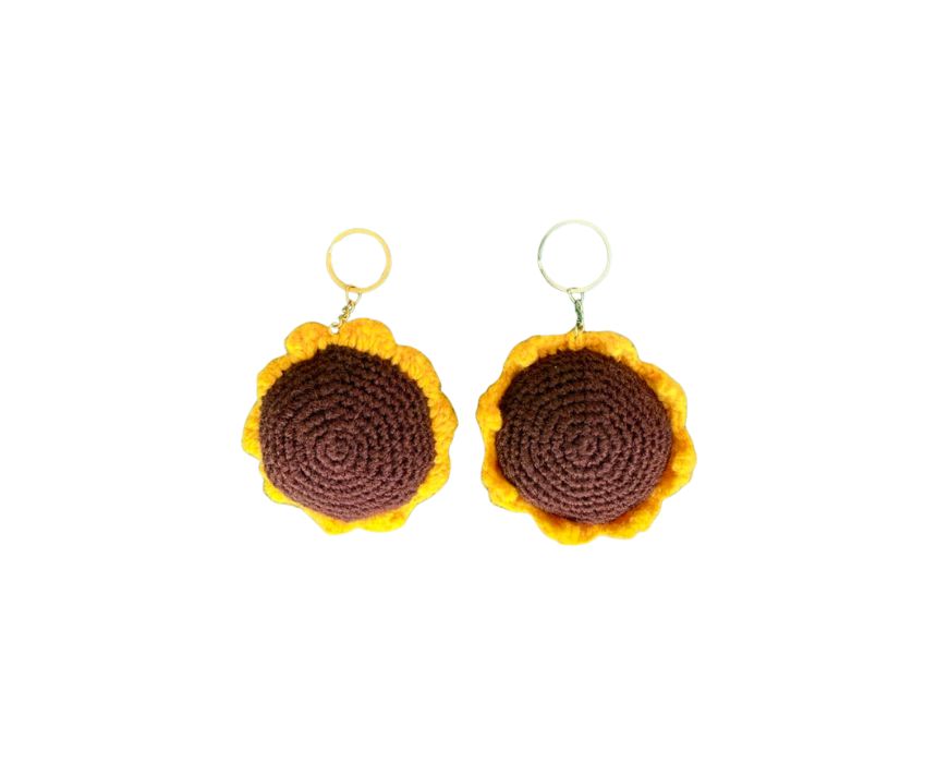 This set of two hand-crocheted sunflower keychains features vibrant yellow petals, a soft brown center, and durable metal rings for secure attachment. Perfect as cheerful gifts or to brighten up keys, handbags, backpacks, or diaper bags, they add a playful and sunny touch to everyday essentials. Clip them on zippers, key fobs, or tote handles for an instant style boost.
