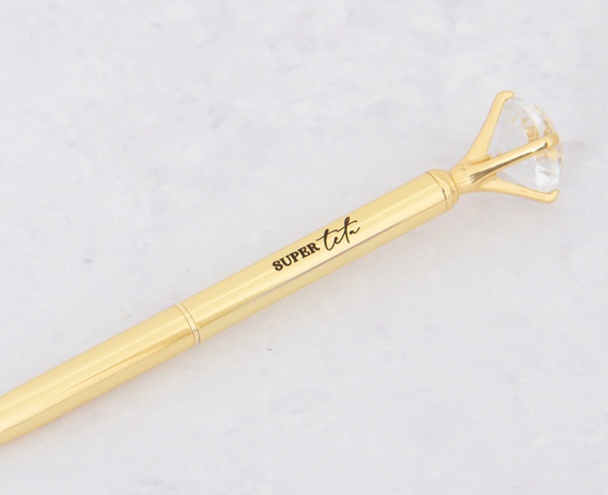 The Super Teta Diamond Pen is an elegant writing instrument featuring a beautiful diamond topper and a custom engraved message designed to honor a special grandmother. This high quality pen uses smooth black ink for a superior writing experience and comes with the flexibility of an optional gift box for easy presentation. To style this meaningful accessory, clip it onto a leather journal or place it in a velvet lined desk tray to create a sentimental and sophisticated focal point for any home office or bedside table.