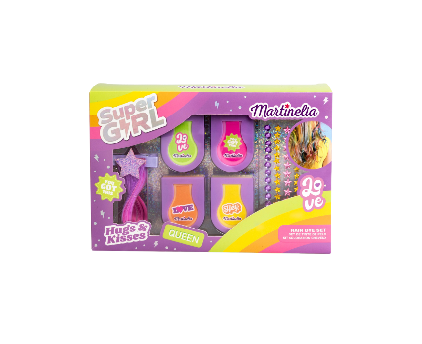 Unleash your inner hero with the Supergirl Collection Hair Gift Set, featuring 4 vibrant hair chalks, a dramatic hair extension, and decorative gems to create a fun, colorful look. Perfect for parties, cosplay, or everyday play, this set lets kids style their hair like their favorite superhero in minutes.