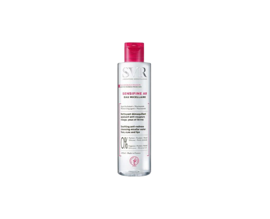 SENSIFINE AR Micellar Water gently cleanses and removes makeup from the face, eyes, and lips while soothing redness-prone and sensitive skin. Enriched with niacinamide and moisturizing agents, it reduces tightness and overheating for immediate comfort. Apply with a cotton pad, leaving it on areas of redness briefly before sweeping to cleanse and refresh the skin.