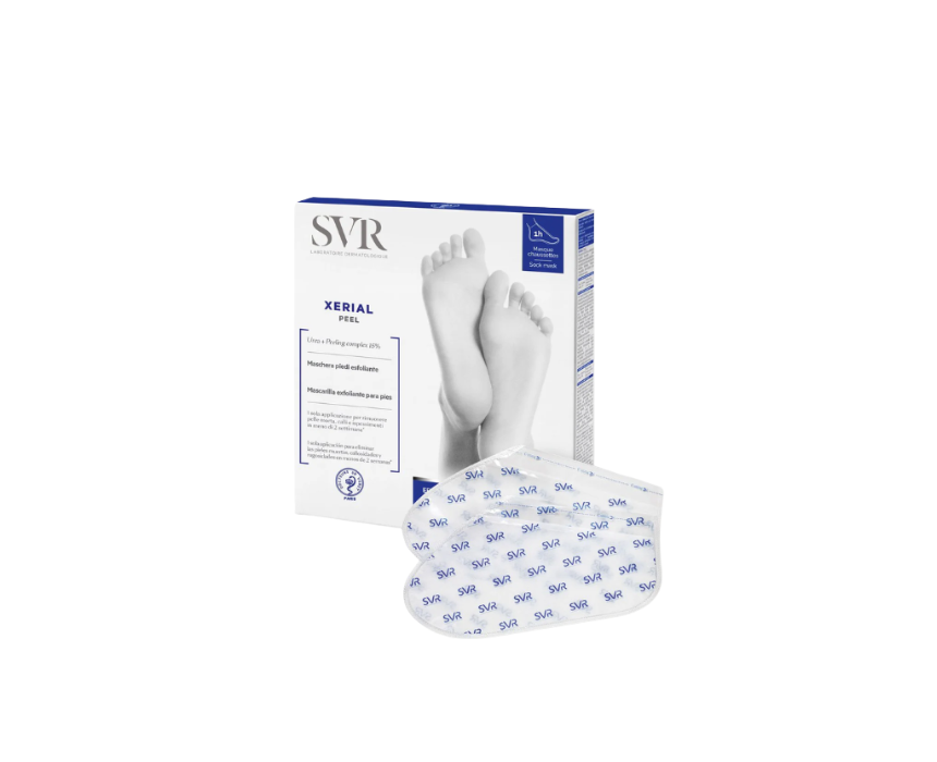XERIAL Peel is an exfoliating foot mask that transforms very dry, callused feet by removing dead skin and deeply hydrating. Concentrated in keratolytic and emollient actives, it targets rough areas while protecting delicate skin. Wear the socks for one hour, rinse, and enjoy softer, renewed feet within two weeks.