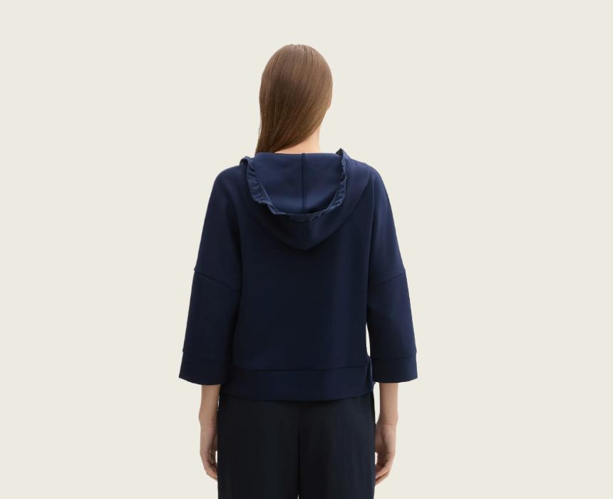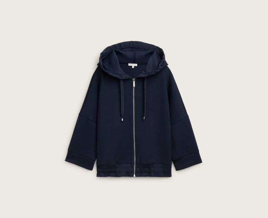 The Tom Tailor Navy Sweat Jacket features a comfortable hood and a zipper closure for easy wear. With 7/8 sleeves, this stylish jacket offers a modern, casual look perfect for layering over your favorite tee or pairing with jeans for a relaxed day out. Ideal for cool weather, it adds a sporty, chic touch to your everyday wardrobe.