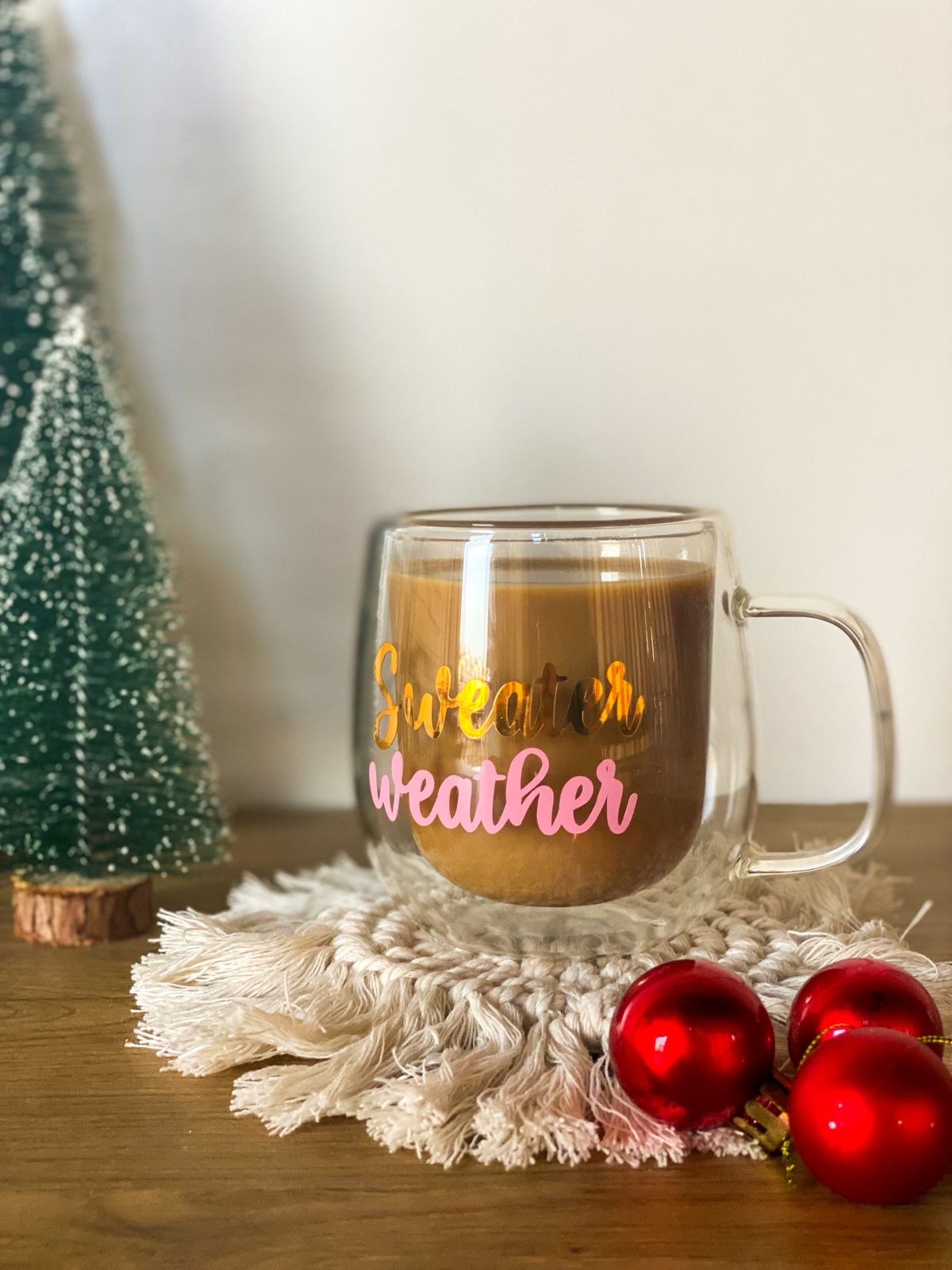 Embrace the cozy season with the “Sweater Weather” Double Glass Cup, a 250 ml borosilicate glass vessel designed to keep your beverages insulated while remaining cool to the touch. This charming double-walled cup is perfect for enjoying everything from warm lattes to iced chai and adds a touch of hygge to any coffee break or autumnal setting. Style it next to a stack of classic novels and a chunky knit blanket to complete your perfect, cozy moment.