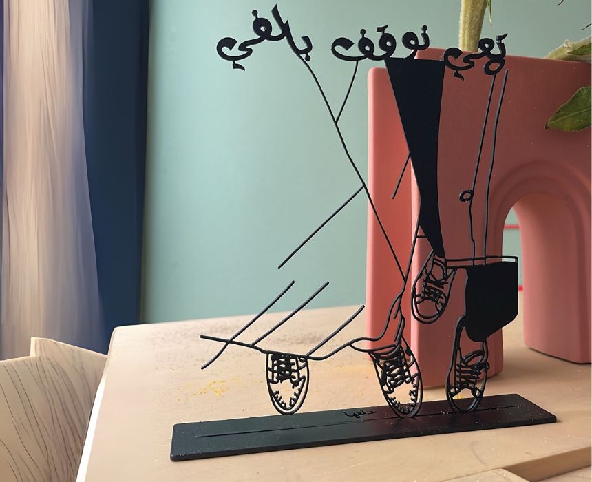 The Ta3i Nou2af Bel Fay Stand is a unique desk display available in medium size (up to 25 cm) and large size (up to 35 cm). Featuring a playful and meaningful design, it adds personality and charm to any desk or workspace.