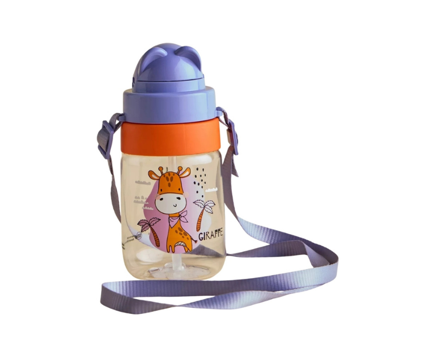 This water bottle has a 330 ml capacity and features a playful giraffe print. Made from safe materials, it is lightweight and easy for kids to carry. With an adjustable strap handle and leak proof sipper lid, it is perfect for school, outings, or daily hydration, combining practicality with fun.